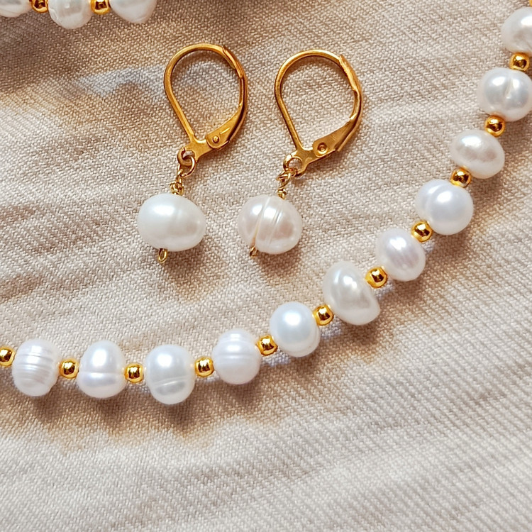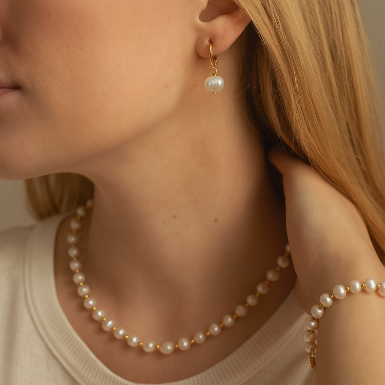 ست گردنبند و دستبند گوشواره مروارید پرورشی اصل با سنگ حدید